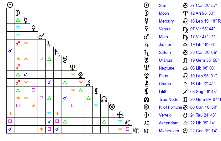 | Sun | 27 Cancer 21 | 28 Cancer 14 | 13 Libra 49 |