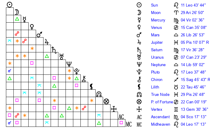 | Moon | 29 Aries 29 | 17 Sagittarius 34 | 1 Aquarius 26 |