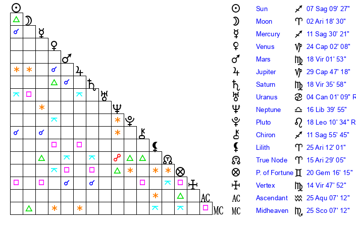 | Saturn | 19 Virgo 5 | 25 Pisces 4 | 18 Virgo 15 |