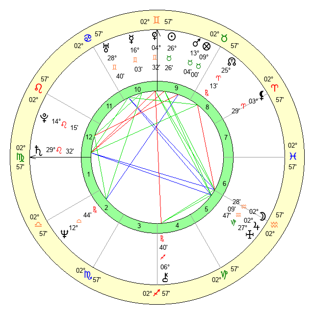 | Saturn | 0 Virgo 3 | 29 Pisces 18 | 6 Virgo 7 |