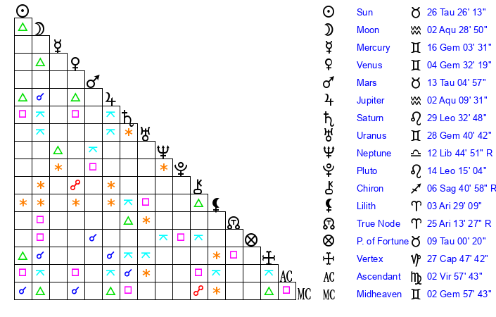 | Mercury | 16 Gemini 4 | 12 Taurus 58 | 15 Leo 29 |