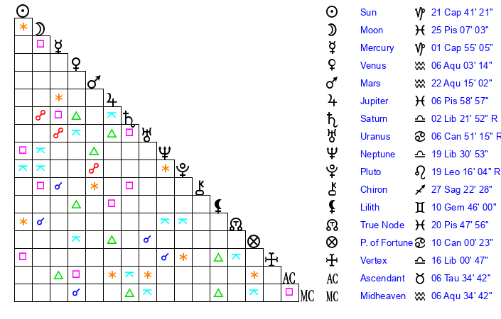 | Neptune | 19 Libra 30 | 29 Pisces 41 | 18 Libra 28 |