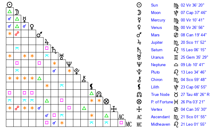 | Mercury | 0 Virgo 11 | 17 Leo 42 | 5 Scorpio 59 |