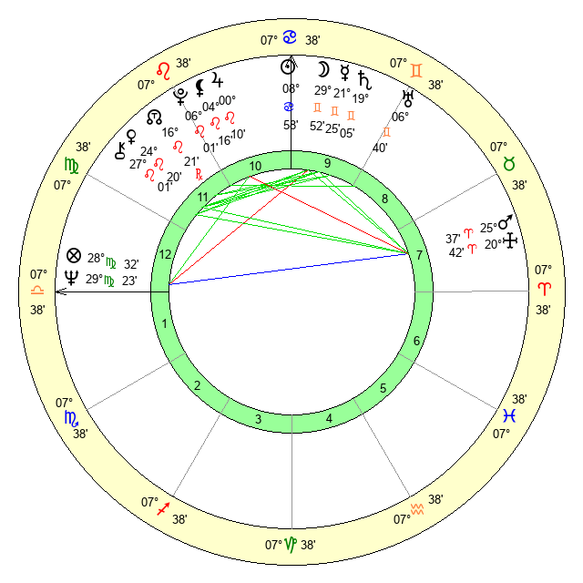| Moon | 29 Gemini 46 | 27 Virgo 56 | 2 Cancer 35 |