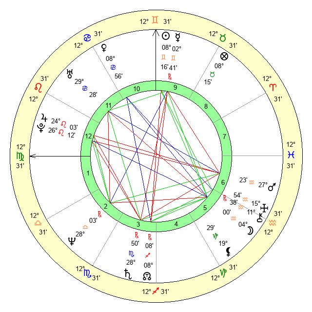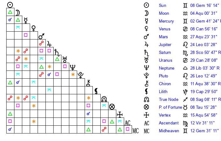 | Sun | 8 Gemini 16 | 8 Gemini 34 | 14 Leo 10 |