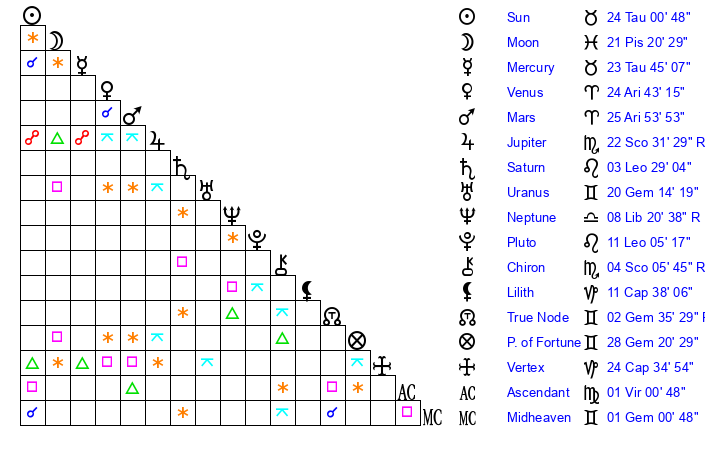 | Jupiter | 22 Scorpio 22 | 24 Gemini 26 | 17 Scorpio 59 |