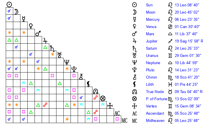| Moon | 20 Leo 40 | 29 Sagittarius 56 | 10 Gemini 3 |