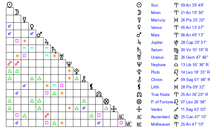 | Sun | 9 Aries 40 | 10 Aries 14 | 23 Gemini 17 |
