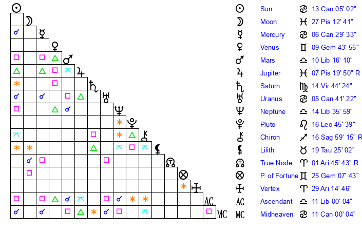 | Sun | 13 Cancer 5 | 13 Cancer 55 | 25 Virgo 12 |