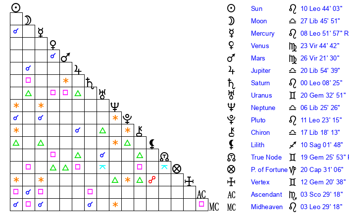 | Sun | 10 Leo 44 | 11 Leo 36 | 27 Libra 42 |