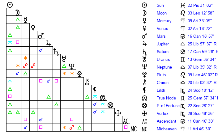 | Moon | 3 Leo 16 | 16 Virgo 46 | 21 Gemini 33 |