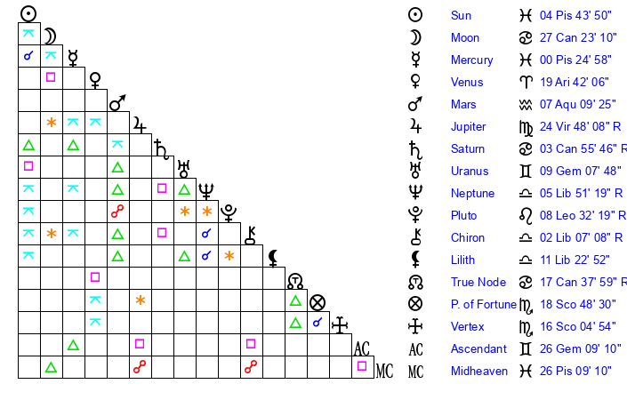 | Neptune | 5 Libra 52 | 28 Pisces 42 | 3 Libra 54 |