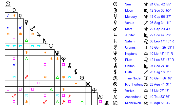 | Neptune | 10 Libra 48 | 27 Pisces 33 | 9 Libra 20 |