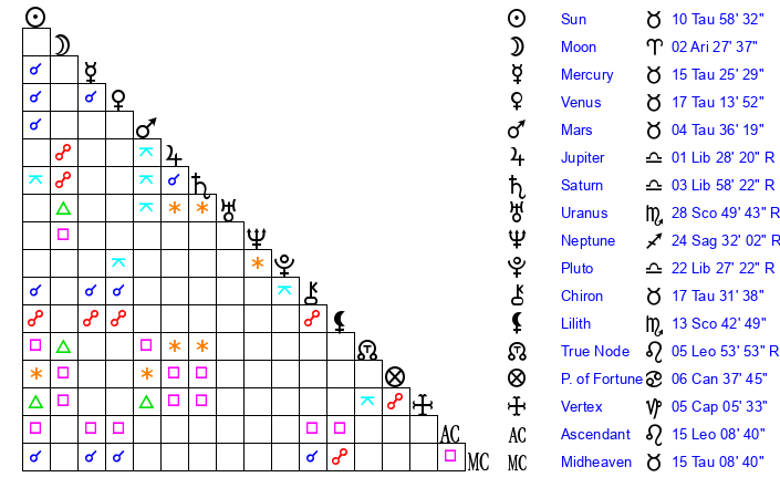 Uranus | 28 Scorpio 53 | 26 Taurus 22 | 27 Scorpio 7 |