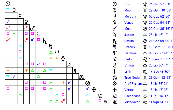 | Venus | 20 Capricorn 55 | 12 Pisces 51 | 29 Aries 36 |