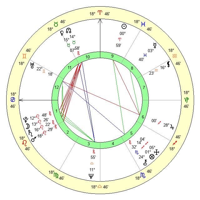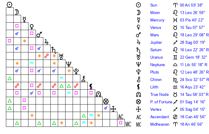 | Sun | 0 Aries 59 | 1 Aries 20 | 15 Gemini 52 |