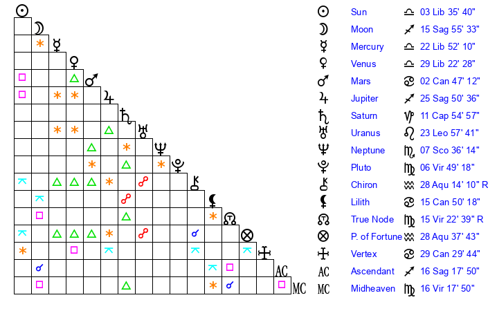 | Sun | 3 Libra 36 | 3 Libra 51 | 8 Sagittarius 30 |
