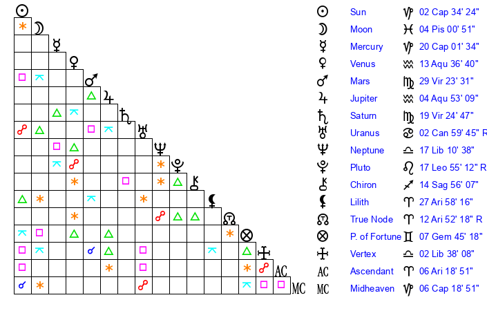 | Venus | 13 Aquarius 36 | 0 Capricorn 2 | 8 Aquarius 43 |