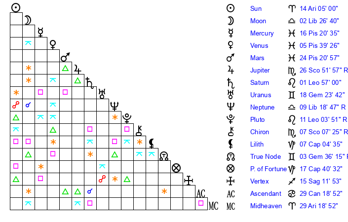 | Neptune | 9 Libra 18 | 0 Aries 11 | 8 Libra 1 |