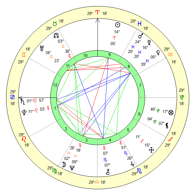 | Moon | 2 Libra 25 | 10 Cancer 26 | 9 Leo 18 |