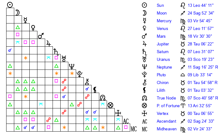 | Neptune | 11 Sagittarius 15 | 1 Aries 53 | 11 Sagittarius 28 |