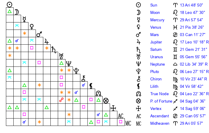 | Moon | 18 Leo 45 | 26 Gemini 40 | 6 Leo 53 |