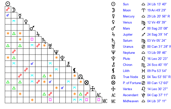 | Moon | 19 Aries 56 | 11 Virgo 53 | 19 Aquarius 59 |
