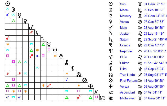 | Saturn | 29 Scorpio 52 | 29 Pisces 43 | 26 Scorpio 38 |