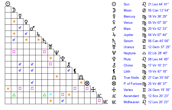 | Pluto | 8 Leo 45 | 2 Aquarius 6 | 10 Leo 15 |