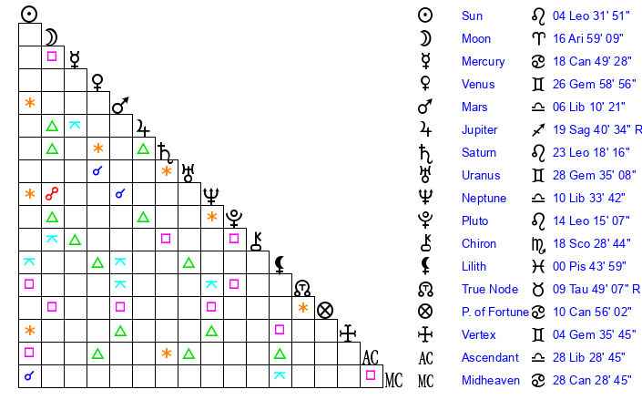 | Moon | 16 Aries 53 | 10 Virgo 48 | 20 Aquarius 12 |