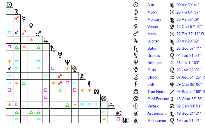 | Moon | 25 Pisces 10 | 6 Virgo 7 | 13 Libra 9 |
