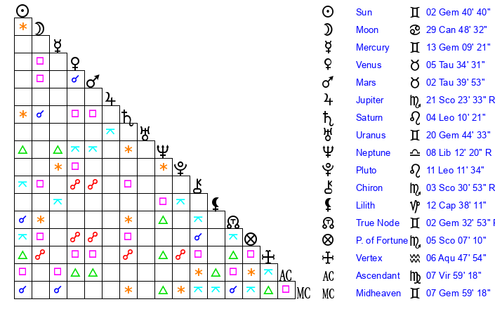 | Sun | 2 Gemini 41 | 3 Gemini 46 | 17 Leo 13 |