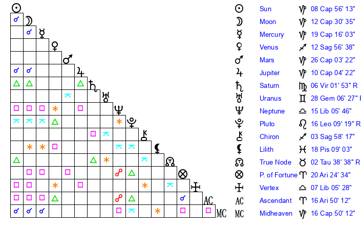 | Venus | 12 Sagittarius 57 | 7 Capricorn 35 | 19 Pisces 4 |