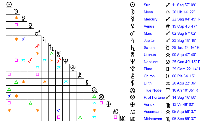 Sun | 11 Sagittarius 57 | 12 Sagittarius 47 | 5 Aries 11 |
