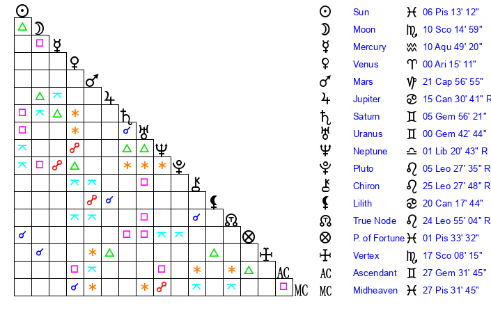| Moon | 10 Scorpio 14 | 6 Aquarius 26 | 11 Scorpio 18 |