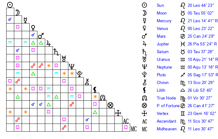 | Moon | 5 Taurus 48 | 17 Aries 50 | 1 Taurus 29 |