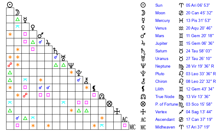 Saturn | 25 Taurus 12 | 23 Pisces 44 | 5 Gemini 19 |