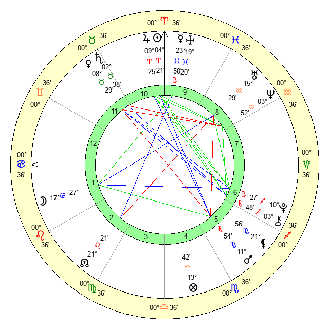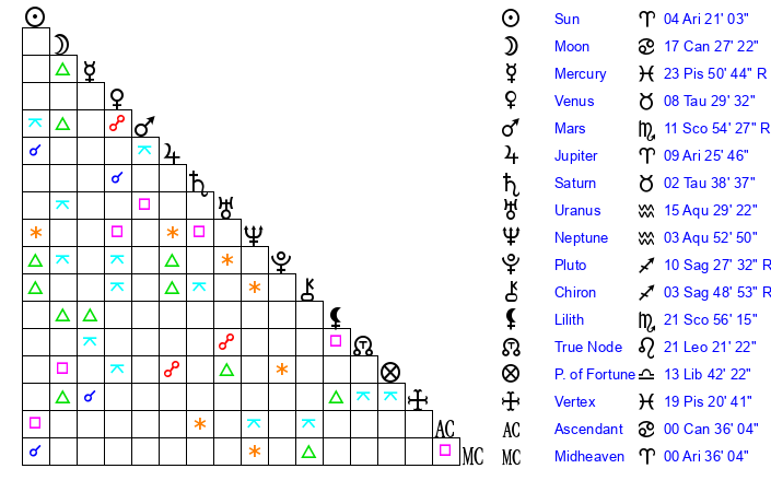 | Moon | 17 Cancer 31 | 10 Aquarius 57 | 29 Gemini 43 |