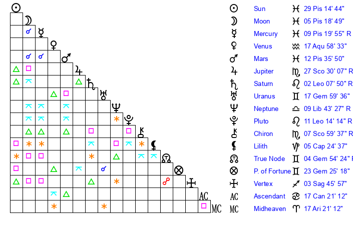 | Moon | 5 Pisces 15 | 10 Sagittarius 10 | 16 Capricorn 46 |