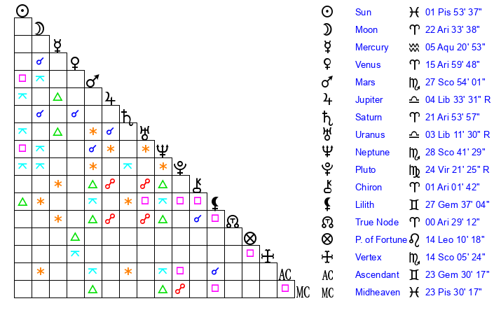| Moon | 22 Aries 32 | 1 Sagittarius 51 | 8 Taurus 27 |