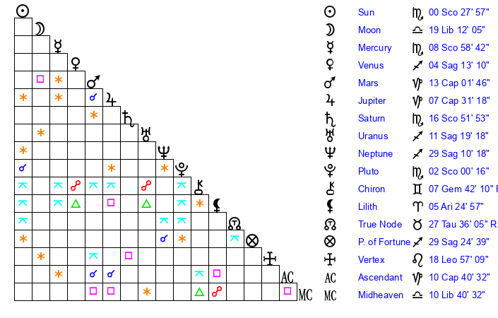 | Moon | 19 Libra 10 | 24 Scorpio 27 | 18 Aries 28 |
