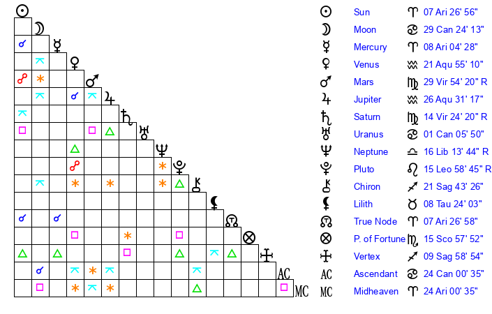 | Moon | 29 Cancer 18 | 27 Pisces 47 | 6 Taurus 42 |