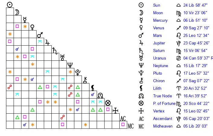| Moon | 10 Virgo 23 | 24 Virgo 15 | 22 Gemini 37 |