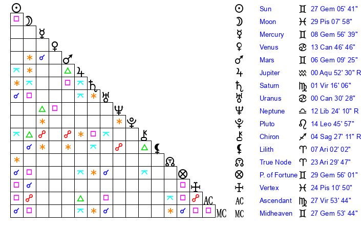 | Sun | 27 Gemini 6 | 27 Gemini 42 | 9 Virgo 52 |