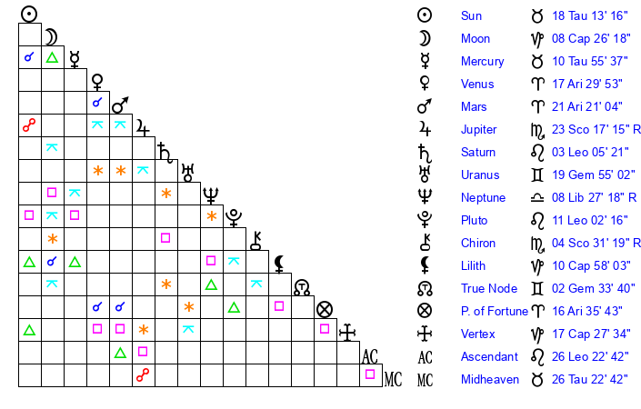 | Moon | 8 Capricorn 18 | 16 Libra 39 | 23 Scorpio 12 |