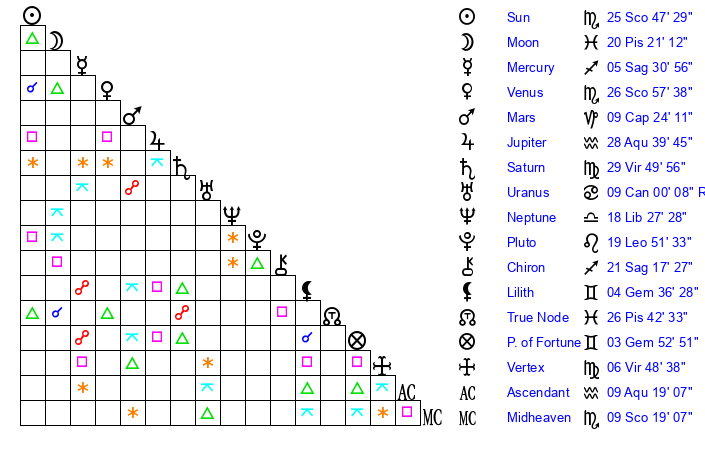 | Sun | 25 Scorpio 47 | 26 Scorpio 36 | 12 Aquarius 2 |