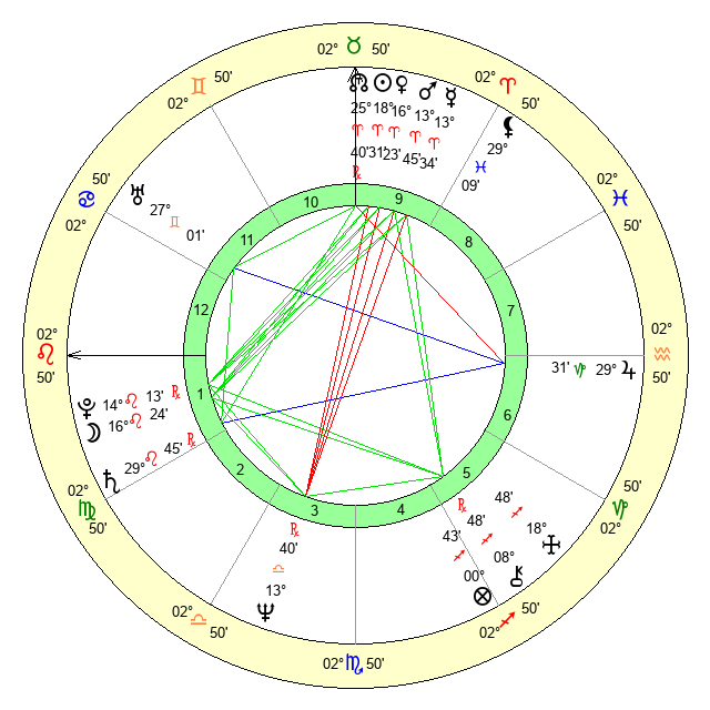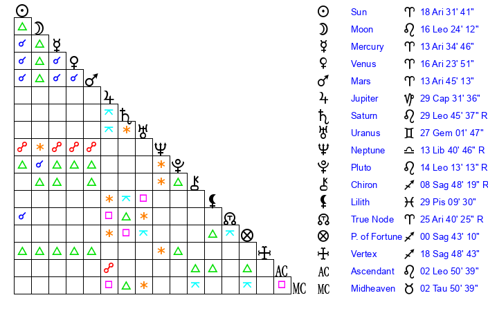 | Moon | 16 Leo 30 | 1 Virgo 40 | 29 Taurus 17 |