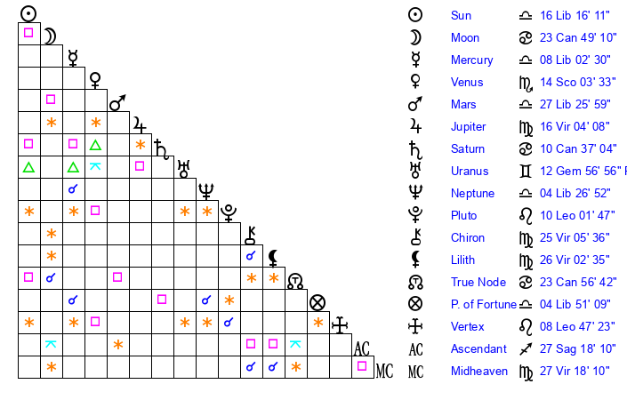 | Sun | 16 Libra 16 | 16 Libra 39 | 7 Capricorn 53 |