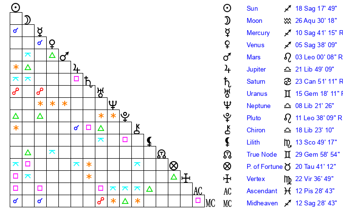 | Neptune | 8 Libra 22 | 29 Pisces 21 | 7 Libra 59 |