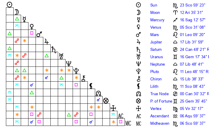 | Moon | 12 Aries 41 | 15 Libra 38 | 16 Pisces 51 |